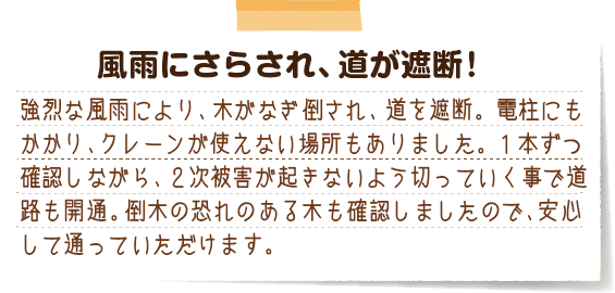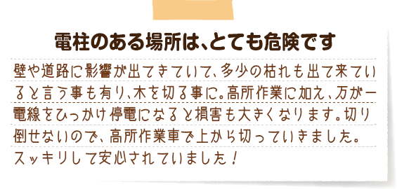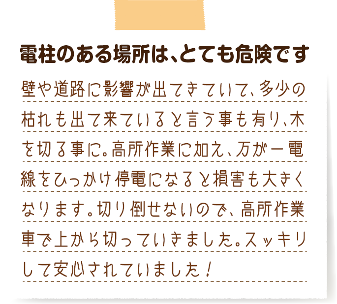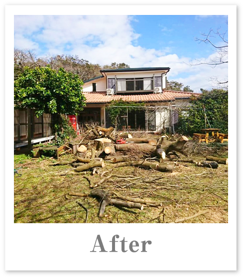 自宅の木の枝が道路にはみだし通行者に迷惑をかけていました。余計な枝を切っていただきスッキリしました。また今後伸びた時のご提案も頂き助かりました。