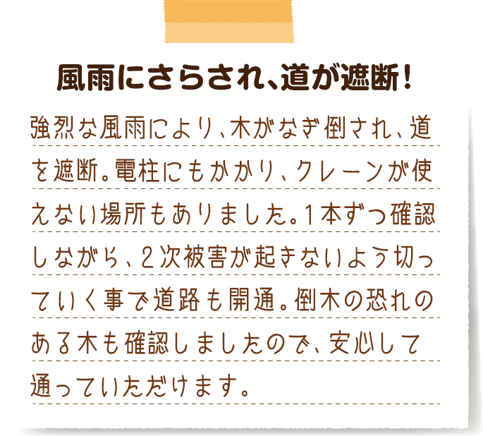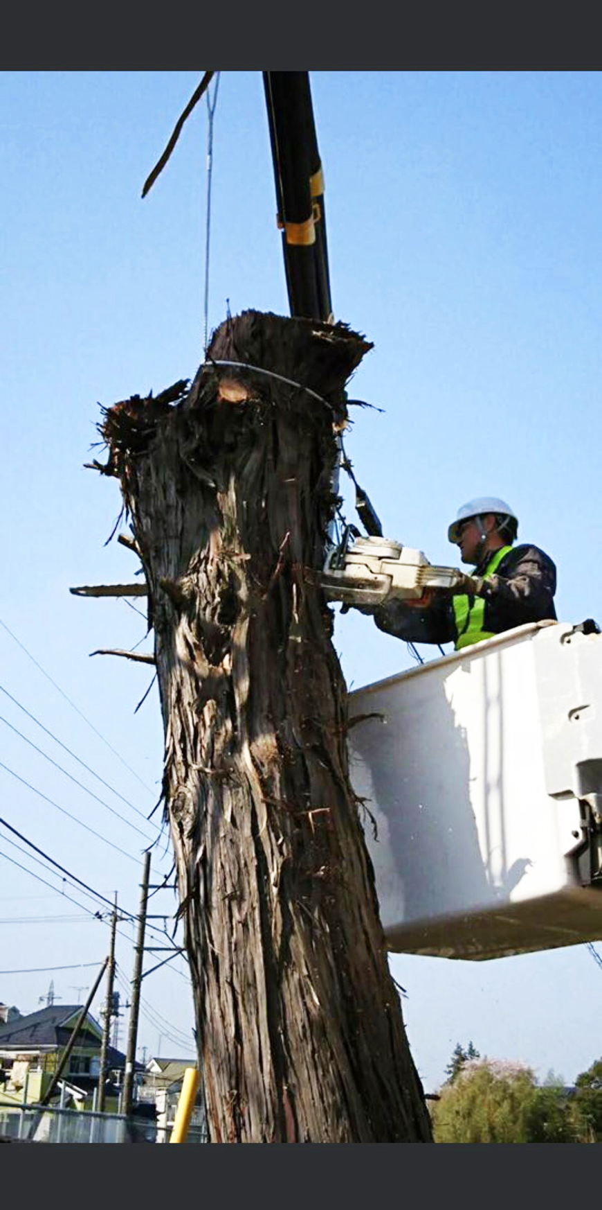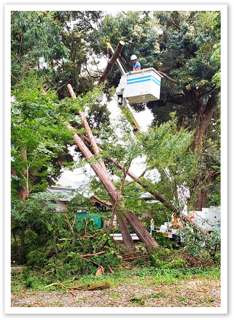 立ち木は、いつの間にか成長し、思いもよらない方向へ伸びます。枝木が折れたり、枯れ葉がトイを詰まらせたりと悪影響を及ぼすことがございます。また、倒木や枝折れによるケガや建物の損傷など被害がでることもございます。