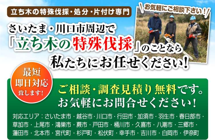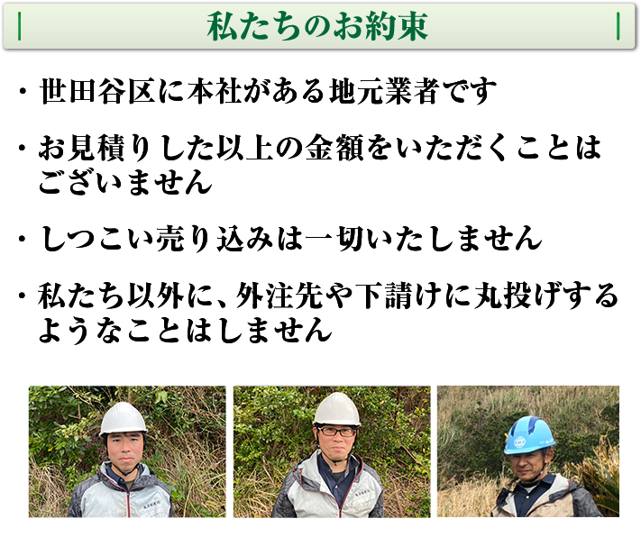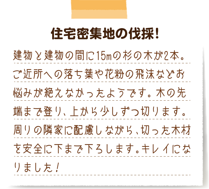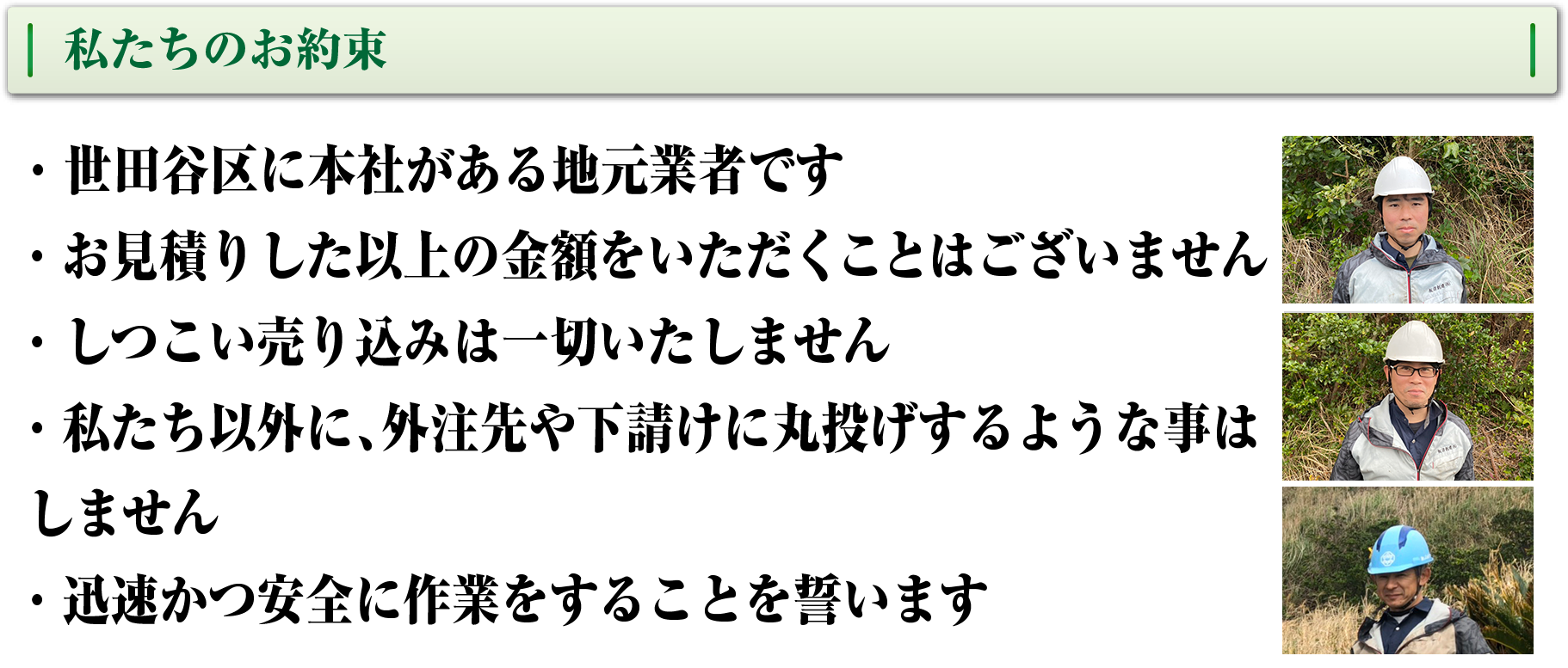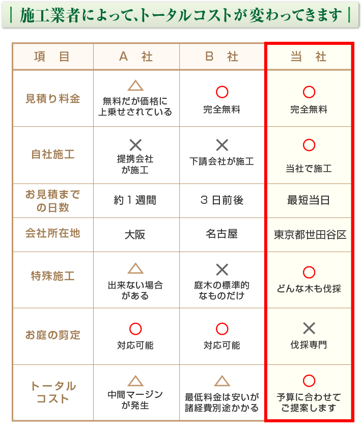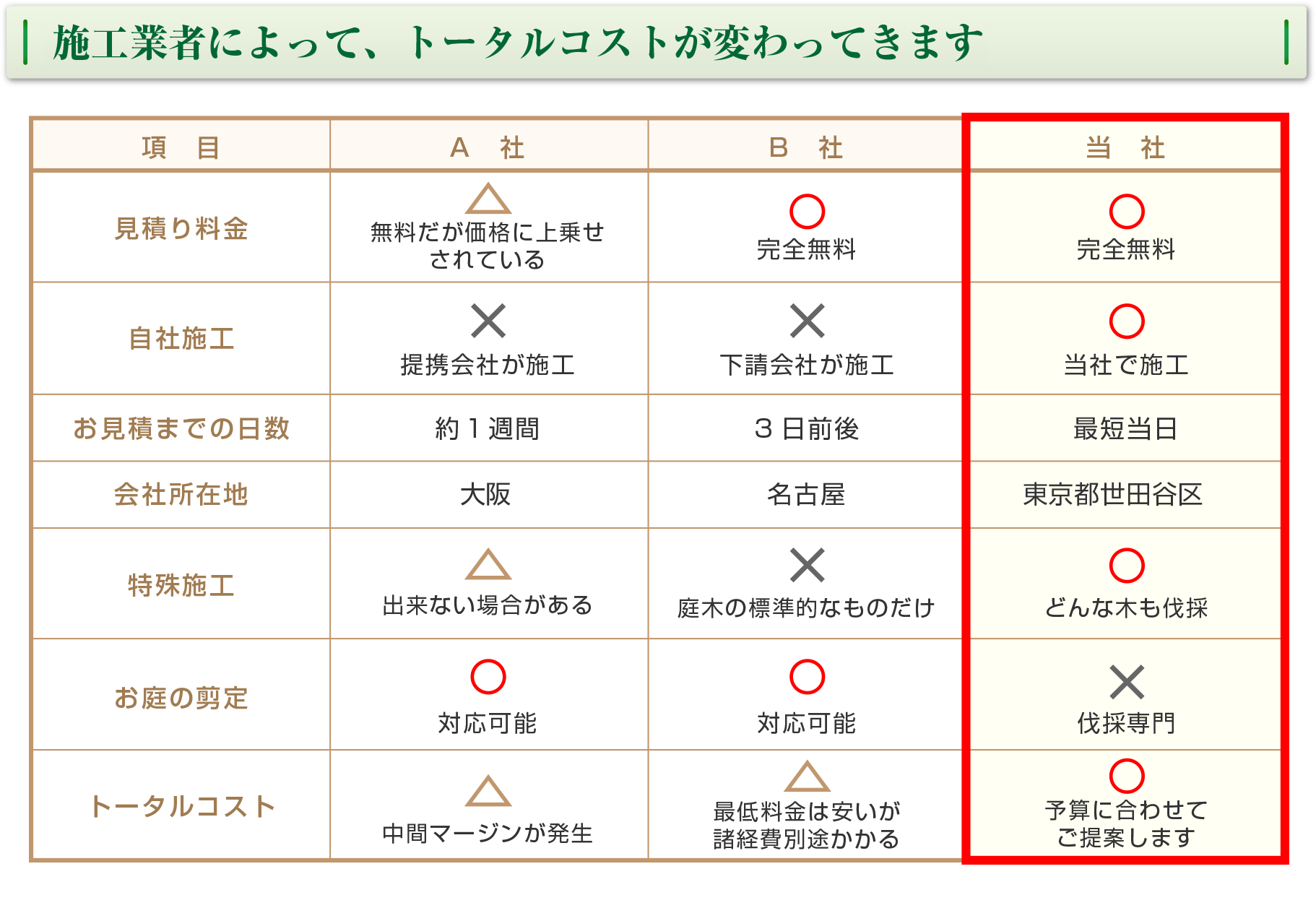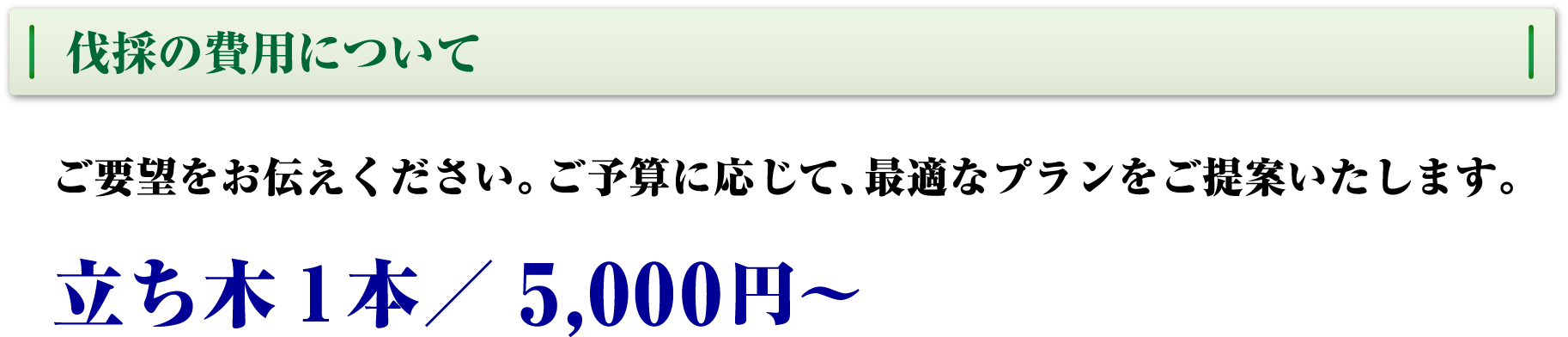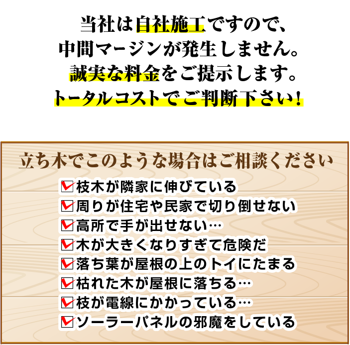 弊社では、お客様のご要望をお聞きしご提案しています。ご予算にあわせて、最低限どこを伐採すれば良いかお話し、誠実な料金をご提示させていただいています。